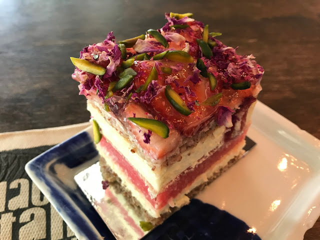 除了招牌草莓西瓜蛋糕之外,喜歡偏酸口感的朋友,我也很推薦『開心果檸檬蛋糕』(Pistachio Lemon Zen Cake) ,由開心果甘納許(ganache)、白巧克力慕斯、檸檬蛋黃醬,再加上開心果達克瓦茲組合而成,入口就可以感受到又濃又純的檸檬味環繞口中。