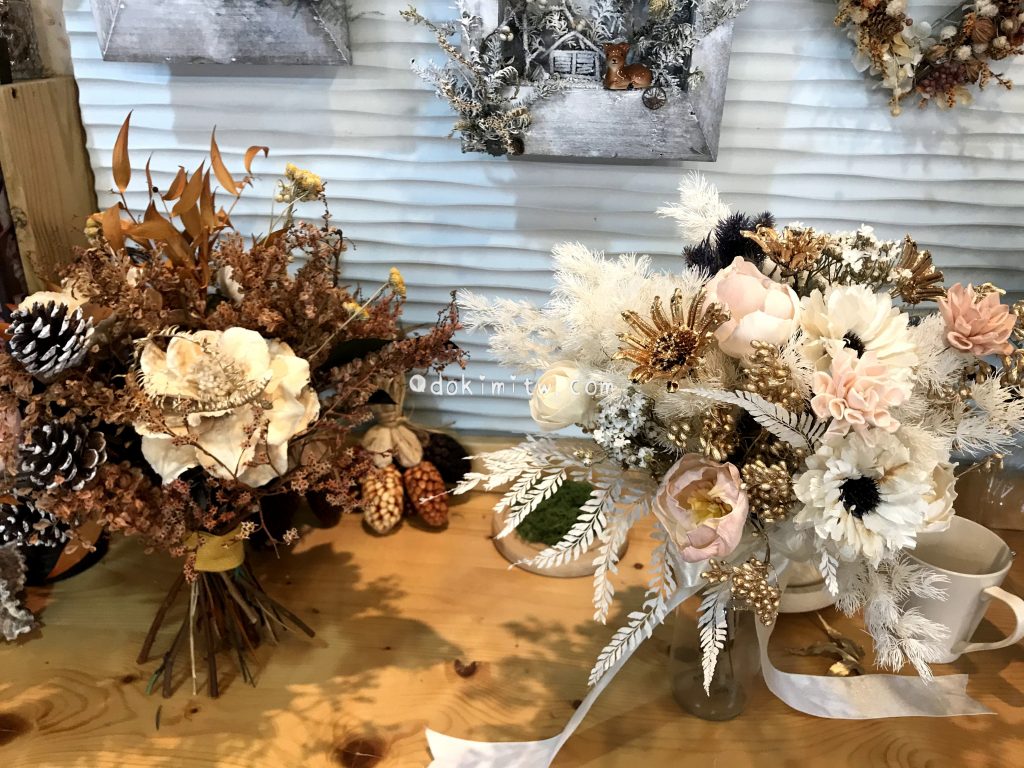 簡單說,永生花主要透過特殊染料,成功保留花材本身的色澤跟形狀,摸起來的觸感柔軟,也比較偏像真花,但價格也相對較高; 而乾燥花則是利用自然風乾的方式,去除花材中的水份,製作出的質地也相對比較硬脆些(通常需水量較少的花材比較適合作為乾燥花)。除了永生花、乾燥花之外,在製作花盅上也常搭配人造纖維作成的人造花。