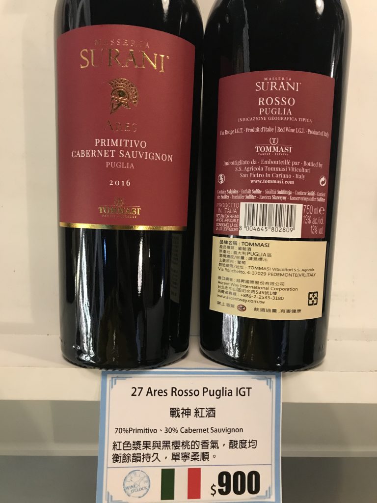 如果以單喝的角度做選擇的話,來自義大利百年莊園Tommasi在南義產區Puglia的(27) Ares Rosso Puglia IGT,果香味豐沛,丹寧順口,飲用起來整體口感與均衡度都蠻好的,就算不搭餐也很適合開來跟朋友小酌時飲用。