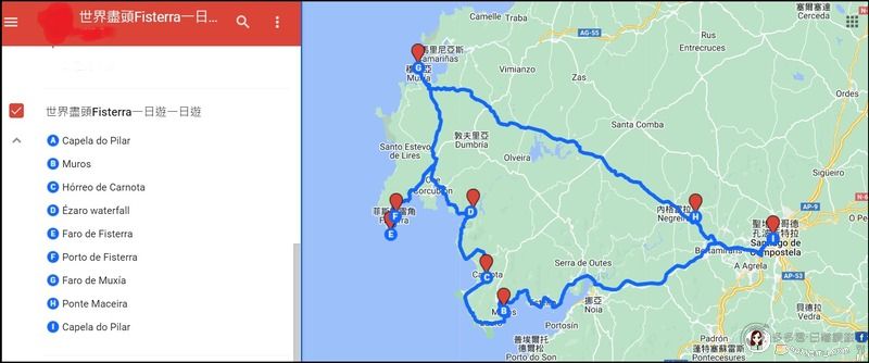 在朝聖之路完成告一段落之後,前往世界盡頭一日遊。行程安排如圖示由A至I,其中A與I為同一地點出發和回程,即Santiago de Compostela教堂Capela do Pilar。