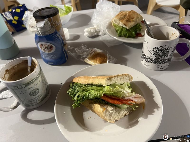 早餐是自己做的三明治和拿鐵咖啡。