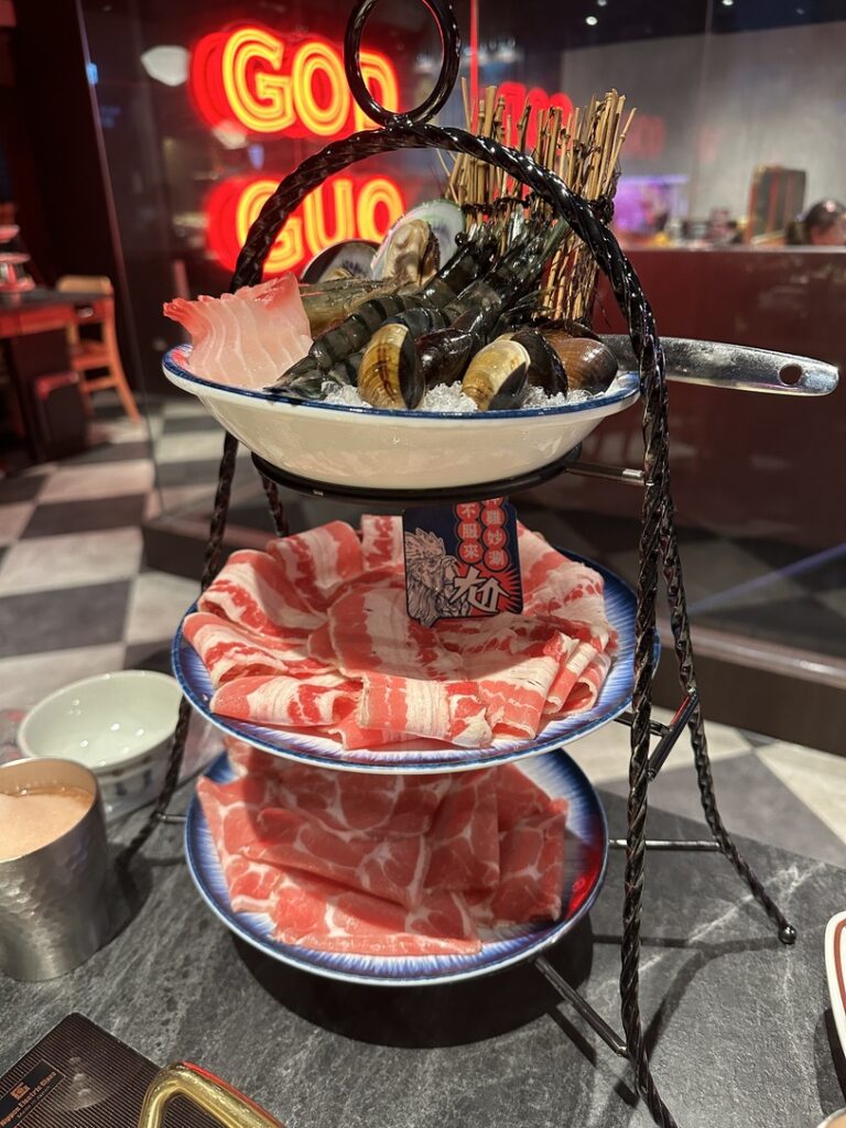 雙人套餐包含了海鮮拼盤(草蝦、鮮蝦、淡菜、鯛魚、蛤蠣),以及四選二的肉品(我們選了雪花牛、豬梅花)。