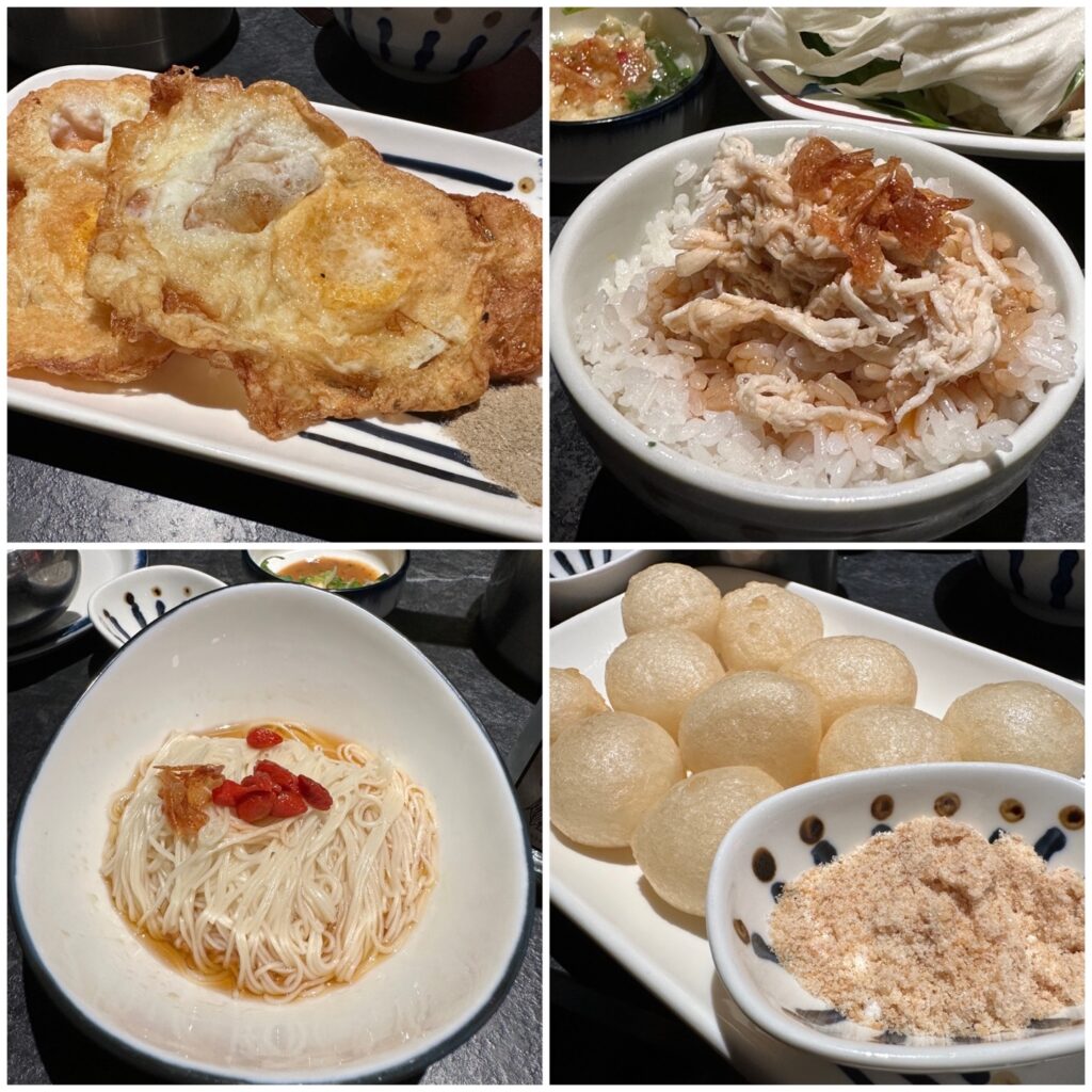 (左上):炸蛋 /(右上):雞肉飯/ (左下)油蔥麵線/ (右下):炸雲朵
