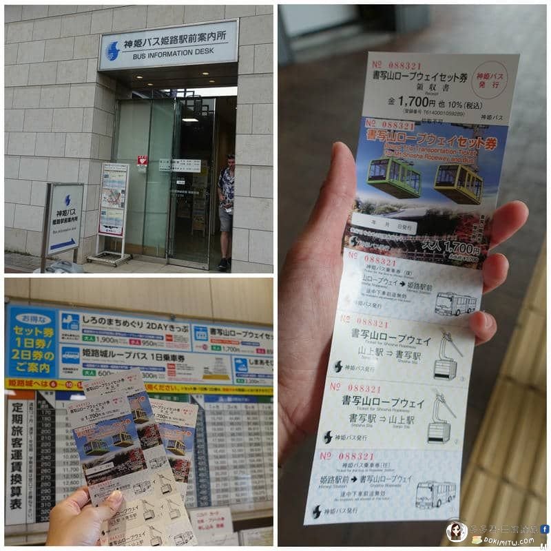 「神姫バス 姫路駅前案内所」內,購買「書寫山」的套票。套票包含公車來回票和纜車往返票,大人JPY 1,700,小孩JPY 850。