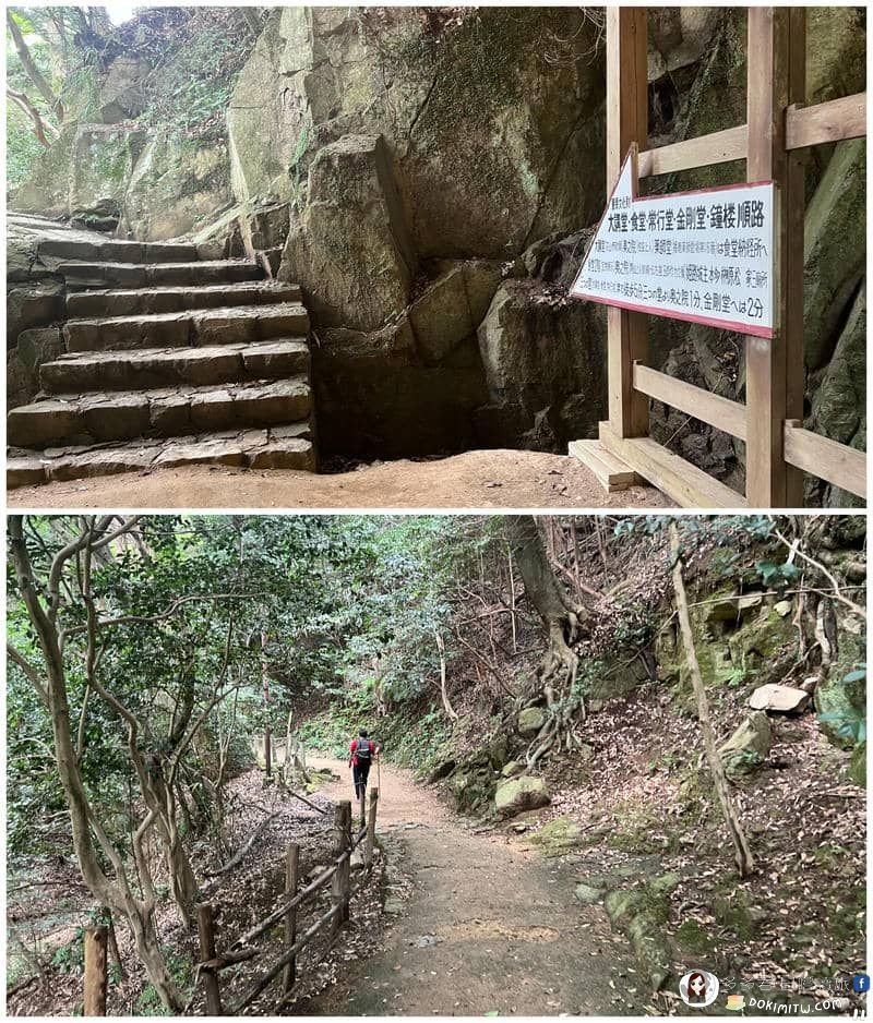 從奧之院,繼續往「展望台・金剛堂」方向前進。這路標是一個三方向的路口,若右走則是「刀出參拜道2.0km」(書寫山六條參拜道之一)。