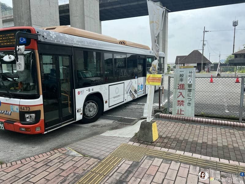 在「JR姬路駅」姬路城口(北口)前的公車總站,10號乘車處,搭乘神姬巴士8路,開往「書寫山ロープウェイ」(書寫山纜車)。