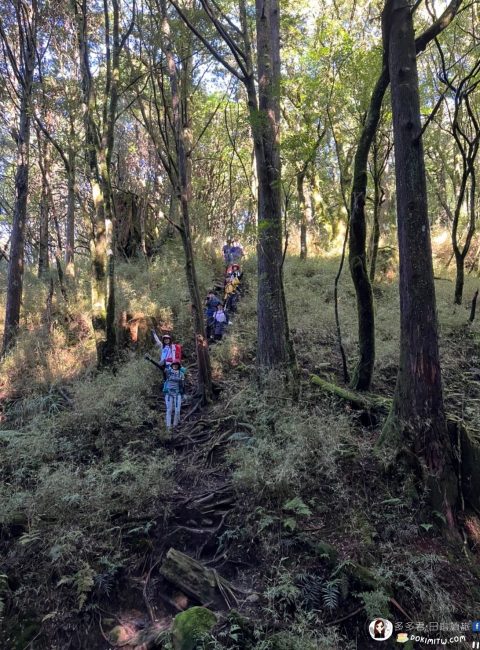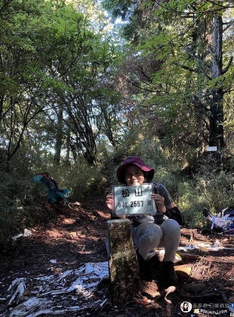 一開始從石猴車站出發的路都還算輕鬆,不過今天很多地方都需要上上下下的,其實不是很好爬,一整團按照行進速度不同,分成了三個小隊,到了8:20,我們打頭陣的第一小隊到了此次阿溪縱走的制高點- 「松山」(2557m)的三角點所在。在松山只是拍拍照、稍作休息,8:30就再次出發。