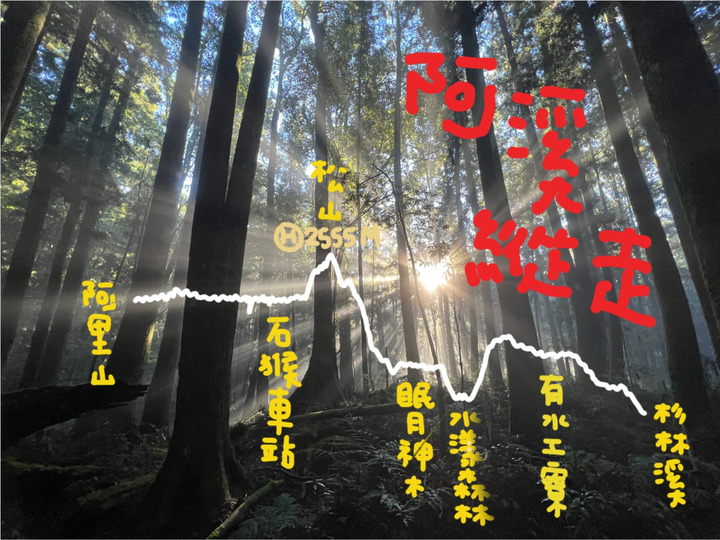 「阿溪縱走」中的「阿溪」兩字,代表的是從「阿里山」出發,一路走到「杉林溪」的路線。當然,也有人會選擇從「杉林溪」出發,再走到「阿里山的「溪阿縱走」。