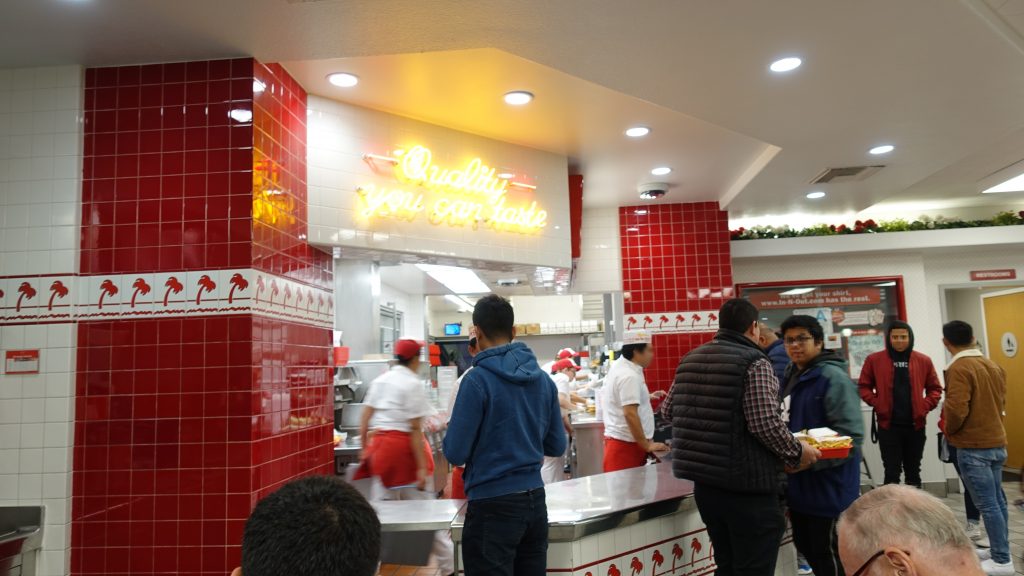 我們到In-N-Out Burger的時間大約是下午五點左右,雖然還不到晚餐時間,但是排隊的人潮卻已非常踴躍,所幸店員的點餐、出餐速度非常快,所以我們並沒有等候太久就拿到餐點了。