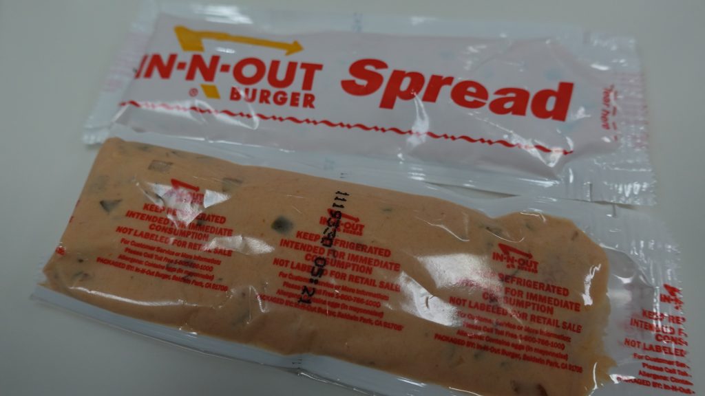 這裡還有一種很特別的In-N-Out Burger獨門醬料,稱為『spread』,吃起來很像是千島醬+酸黃瓜醬的綜合體,主要是利用番茄醬、美乃滋、酸黃瓜醬製成。如果是點animal style fries (薯條+起司+烤洋蔥+spread),也會加上這種獨家醬料。或者,取餐時也可以跟櫃台說想要spread,就可以直接加在薯條或是漢堡中。