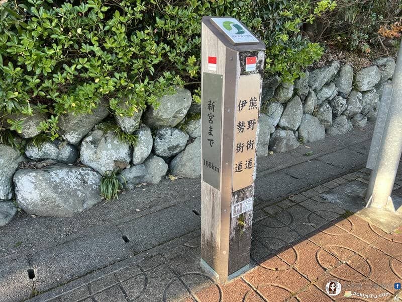 在外宮入口處,先往右移幾步路的路旁,此處是「伊勢街道、熊野街道」的標誌。「伊勢路」每4km一座里程碑標誌,這裡是第一座里程碑,它標示「往右走至新宮166km」。