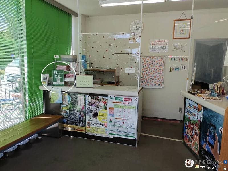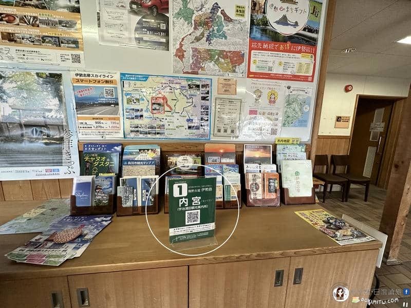 外宮前観光サービスセンター(外宮前旅客服務中心)內的櫃檯上,放置「伊勢路」QR Code讀取集章,外宮是32個QR Code中的第二個,因此左上角「2」數字。(照片圓圈部分)