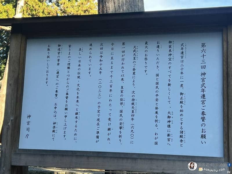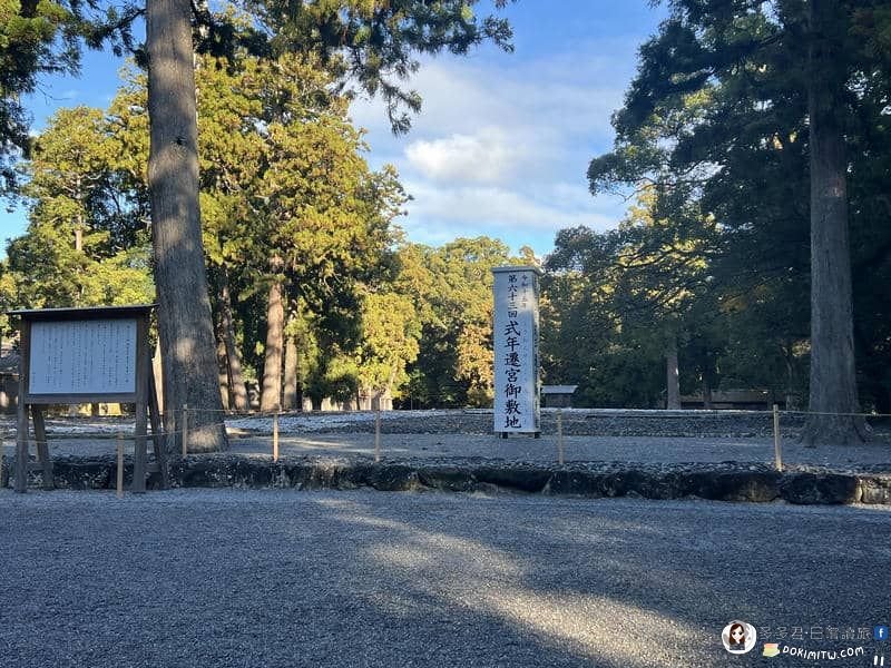 伊勢神宮每20年舉行一次遷宮儀式,所有125座神社都會重建新建築。「式年遷宮御敷地」是新正宮所在地,每次遷宮後,本宮位置都會向左或向右移動。「式年遷宮」的意義非凡,因為它象徵著永恆不變的祭祀儀式,並且將建築技術傳承給後代也至關重要。