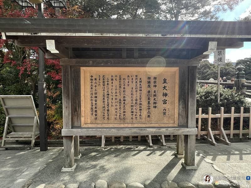 外宮是供奉衣食住產業的守護神「豐受大御神」,入口的「由緒」(日語,意思是由來、來歷、淵源)這麼寫著。