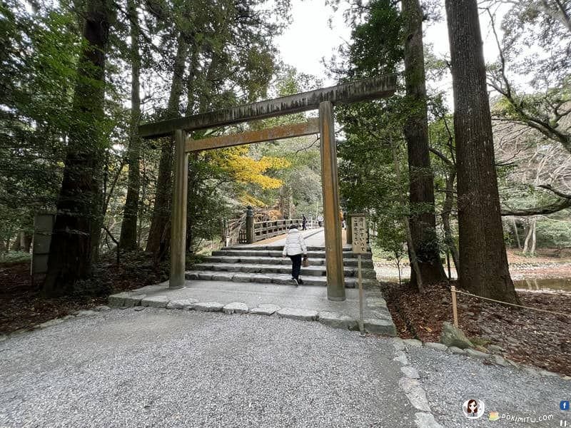 進入伊勢神宮內宮一定會經過 「宇治橋」,它橫跨五十鈴川,象徵由凡界走入聖界。「宇治橋」兩橋頭都有鳥居,這裡是西側鳥居。日本人進出鳥居時一定鞠躬參拜,宇治橋分成兩邊,也特別提醒「靠右走」,此與內宮不同。