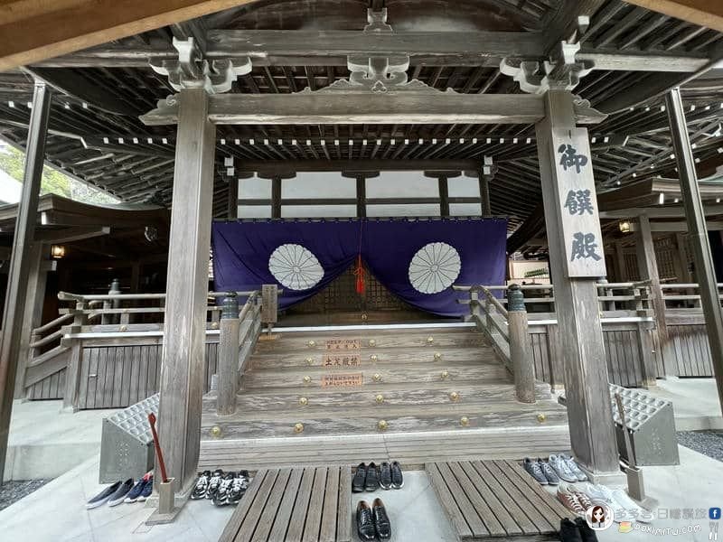 皇大神宮「內御廄」(神樂殿前)與「外御廄」(參集殿前),飼養皇室引入的神馬,每個月1、11、21日早上八點會穿上繡有菊花冠飾馬袍去參拜神祉。
