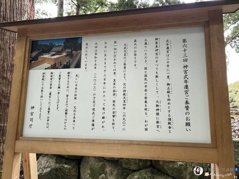 「式年遷宮」,始於持統天皇四年(690年),至今一千三百多年。最近一次遷宮是第六十二回於 2013年10月2日舉行,下一回第六十三回預定於令和十五年(2033年)。