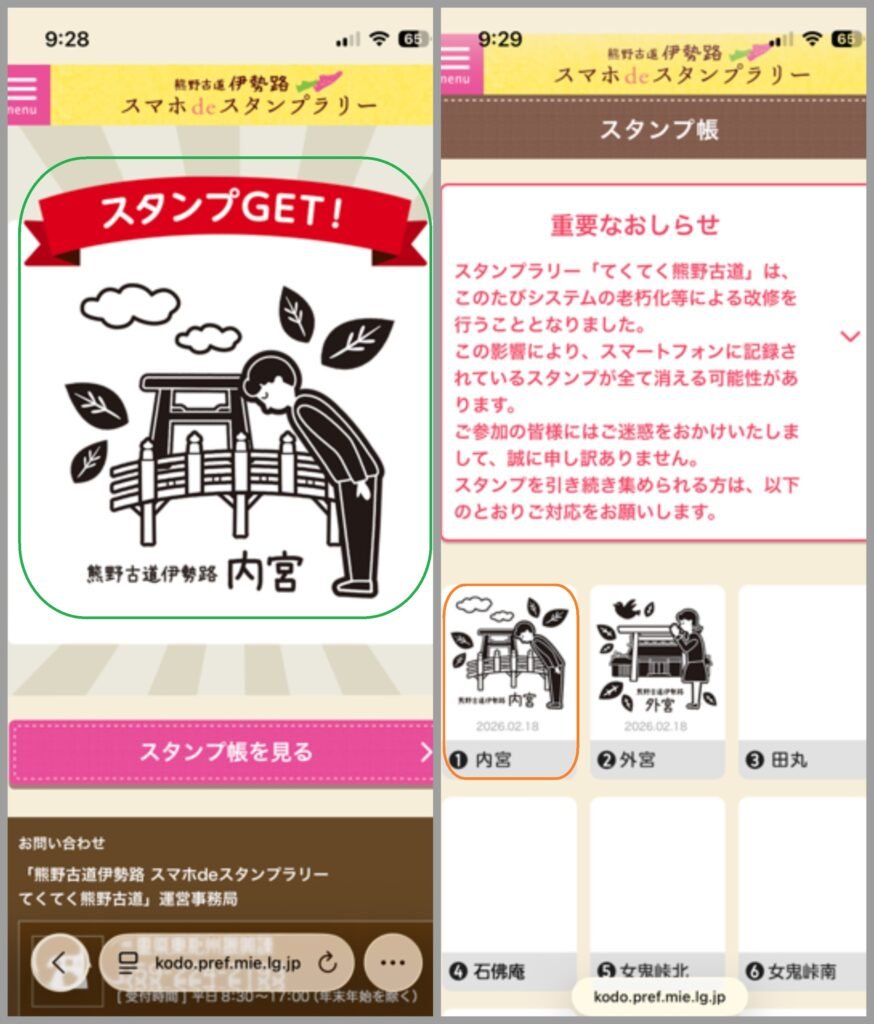 以手機掃QR Code讀取,則手機上出現二画面,左是取得「內宮」集章,右為集章「內宮」打印。(押印章1是內宮,押印章2是外宮)