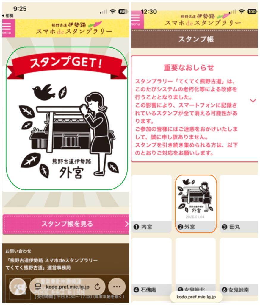 以手機掃QR Code讀取,則手機上出現二画面,左是取得「外宮」集章,右為集章「外宮」打印。