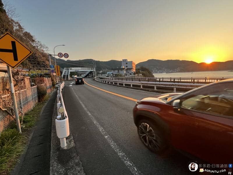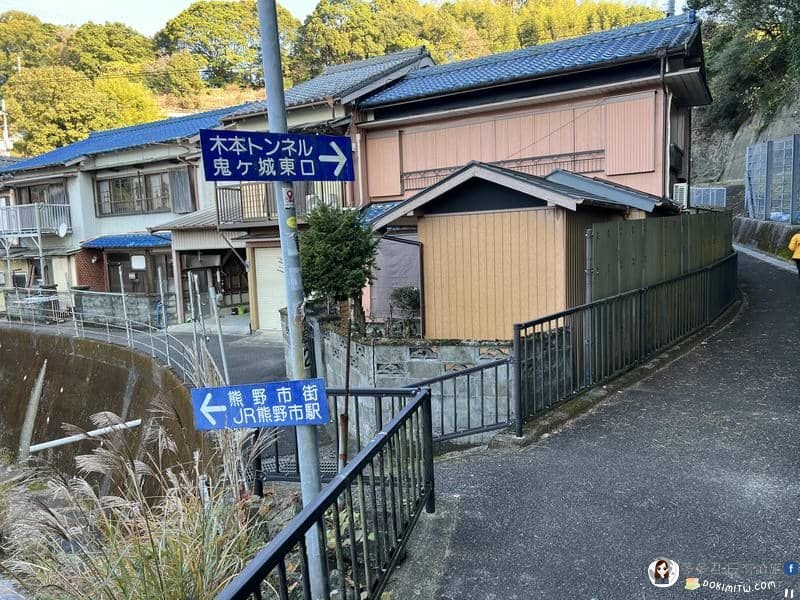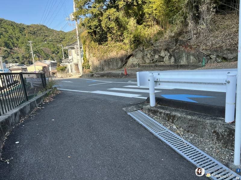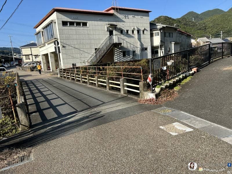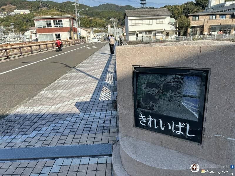 從西口走出,穿過國道#42高架下方,來到此橋前的路口。如果往熊野市街道和「七里御濱」,就要過橋直走。如果想回東口(走隧道),像我們一樣回民宿,則往右走小路。