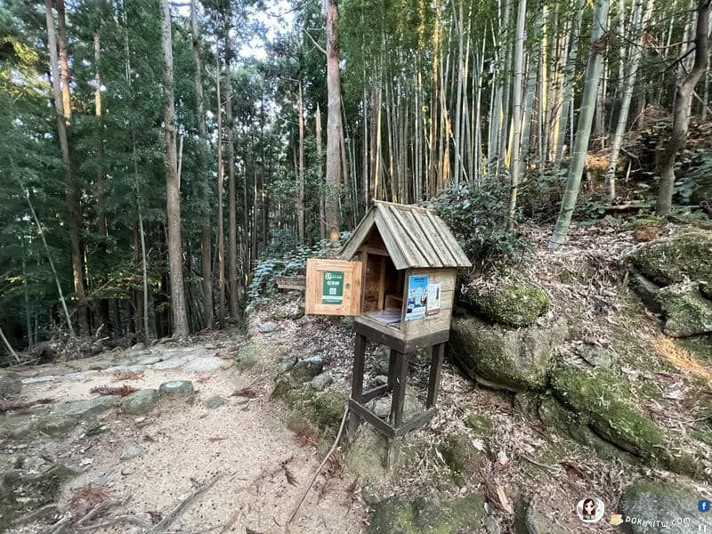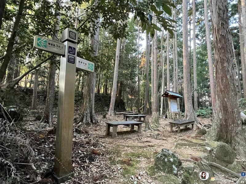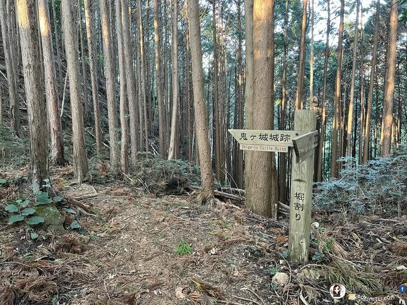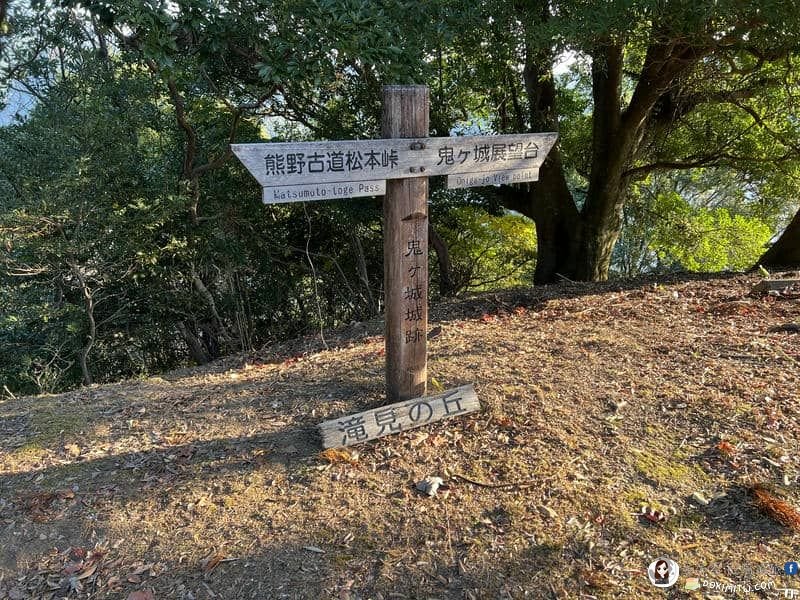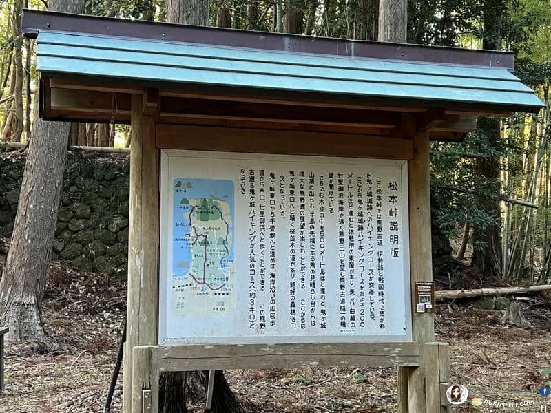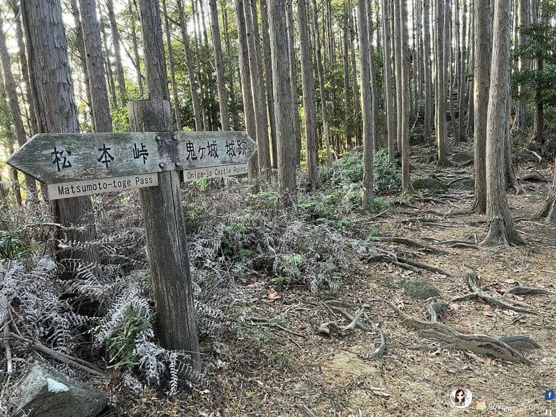 「松本峠」路口,來時上山(大泊側)登山口是國道#42,直走是下山(木本側)登山口,據說是明治時代舖成的。而由此處左走,為「鬼城 城跡」。路標:木本登山口600m、國道42號500m、鬼城跡700m。