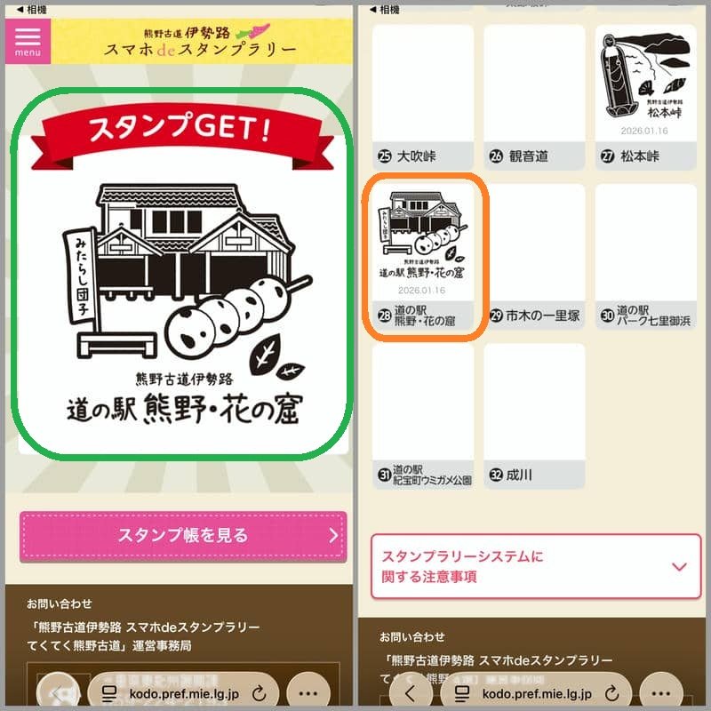 在手機上,掃QR Code讀取,則手機上出現二画面,左是取得「道の駅 熊野・花の窟」集章,右為集章「道の駅 熊野・花の窟」打印。