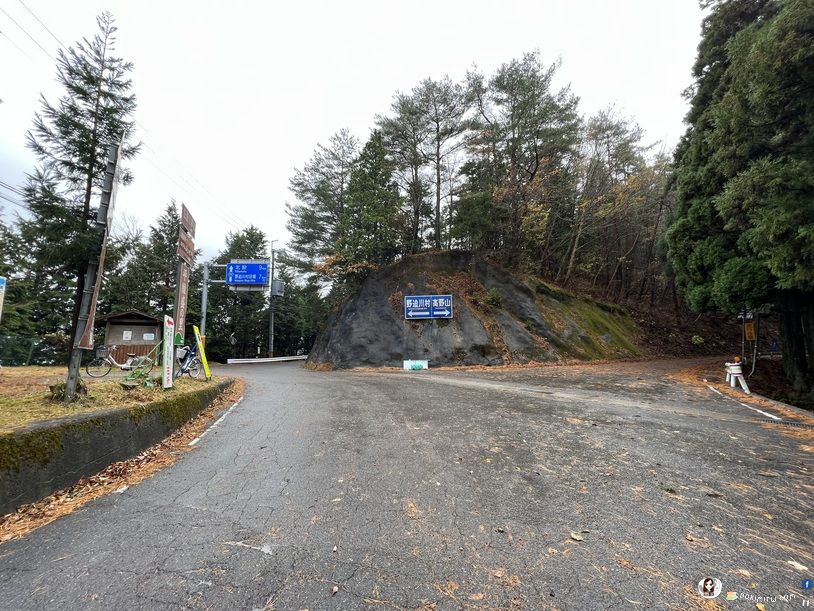 天狗木峠(陣ヶ峰)三叉路口,三方向分別往高野山(東)、野迫川村(南)和小代下(北轉西)。 (右邊那條路是從高野山走過來)