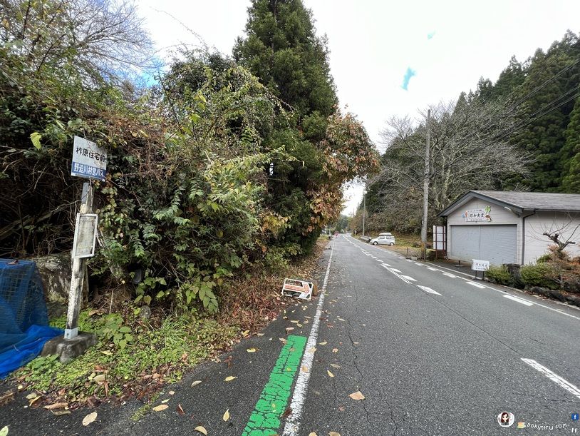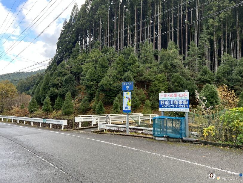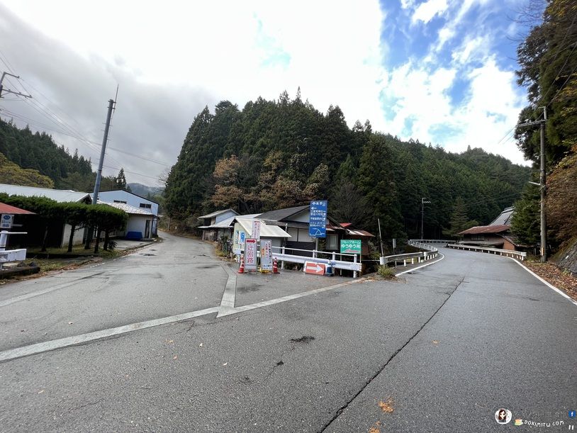 野迫川村營巴士「柞原住宅前」站,及對面的「昭和食堂」(野迫川村營巴士為野迫川村役場與小代下之間行駛路線,並沒有大峰道直接往高野山的巴士)。