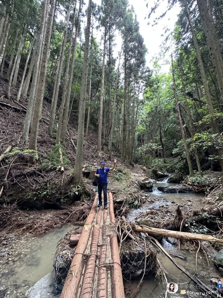 颱風過後兩天,溪谷上的木橋也有被沖走了,使得我們只能涉水而過;古道上的小徑,由於坍方土石堵住古道的去路,我們只好往上攀爬,越過鬆軟土石,再回到原古道上。