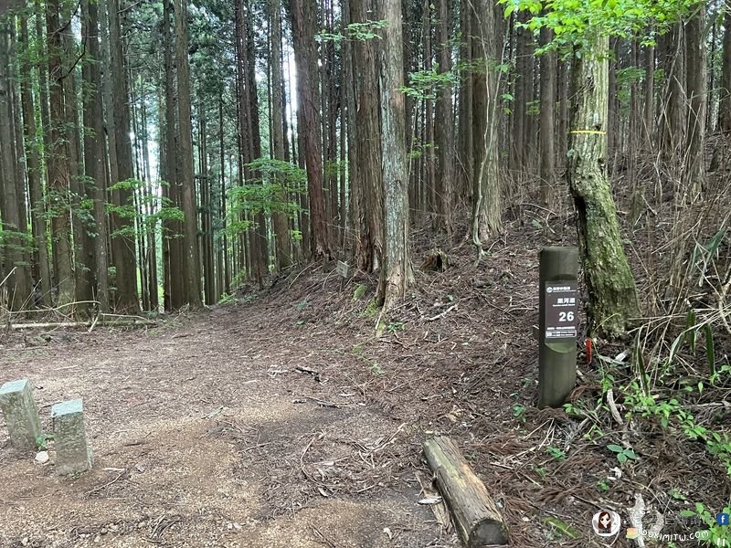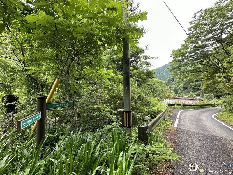 下到林道上,隱約看到前方不遠處有一座橋,路標:市平橋0.1KM、明神ヶ田和1.9km(前方3m左上)。