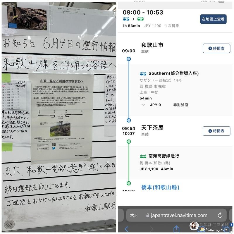 在和歌山駅,得知受颱風侵襲導致JR和歌山線部分路段停駛,不能直接搭電車往橋本。當機立斷,尋求其他可行方案,改搭南海電鐵繞道。