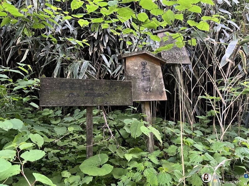 「黒河口女人堂跡」,遺址上豎立說明看板及木板標示牌。