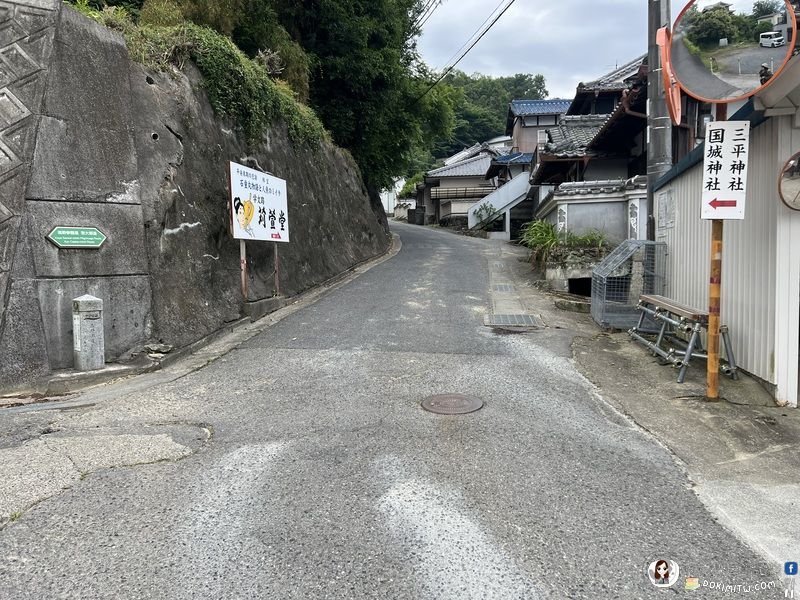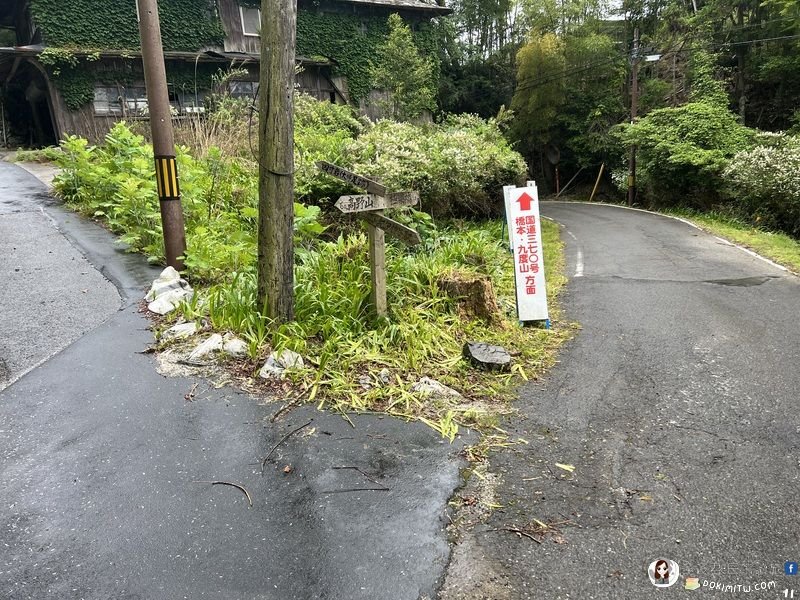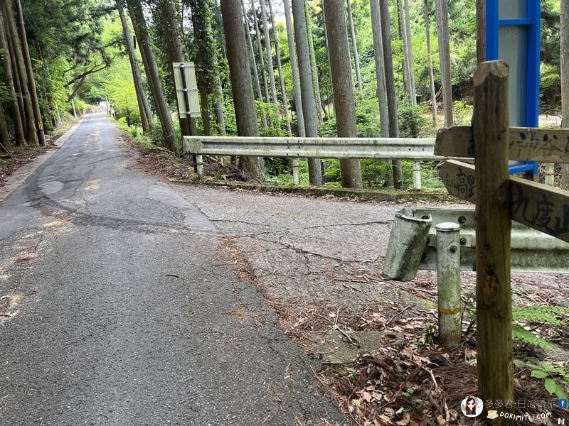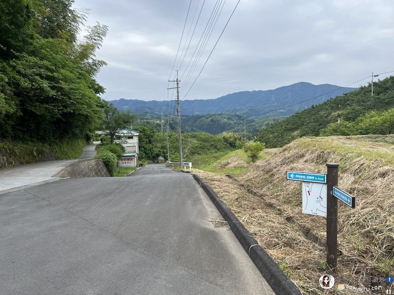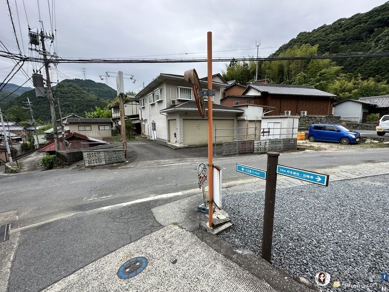 離開日輪寺,繼續行程。在河根集落,穿過十字路口。路標:千石橋0.4km、丹生神社•日輪寺30m。
