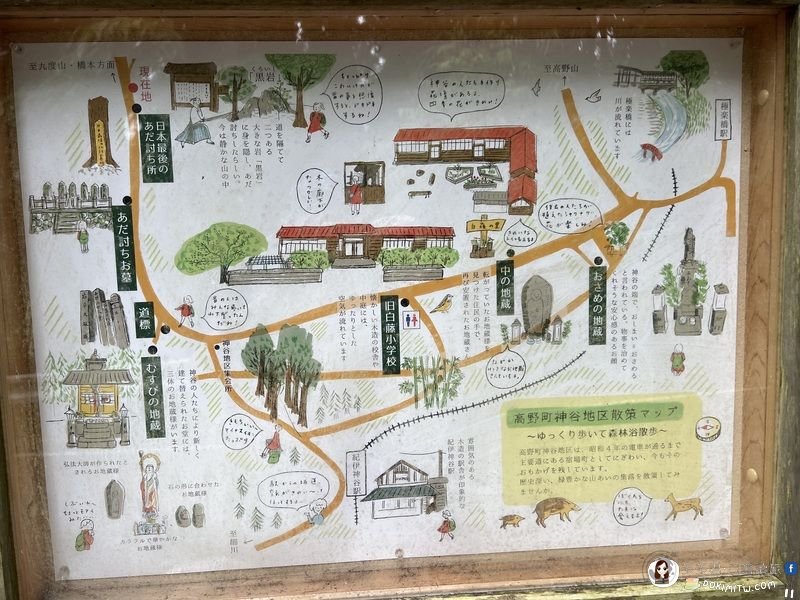 千石橋北端,安置「二里道標石」、八坂神社,還有一幅九度山町地圖。