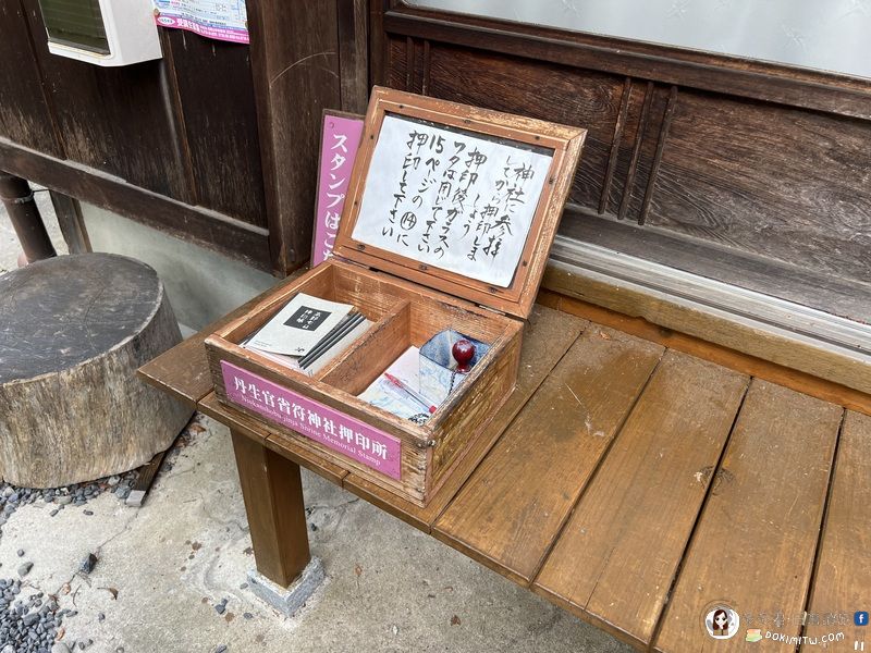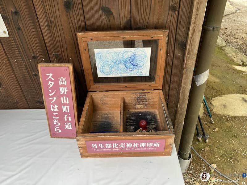 高野參詣道「町石道」,「高野七口押印帳#15:丹生都比売神社押印所」,放置在社務所・授与所前角落,開放時間為08:45-16:30。