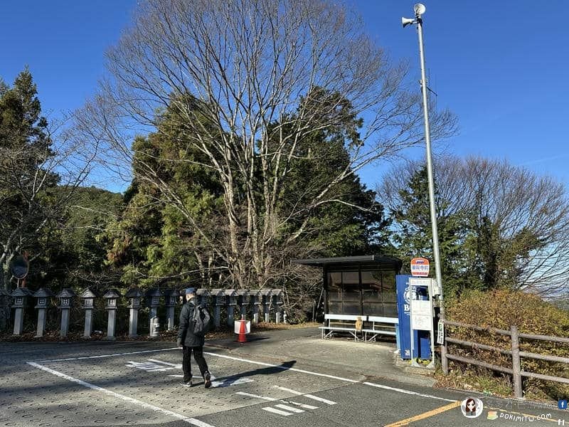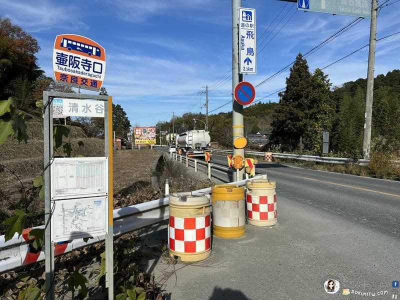 剛才,我們就是從公車候車亭旁的小路走上來的。奈良交通「壷阪寺前」站牌,公車僅限每周六日和國定假日行駛。