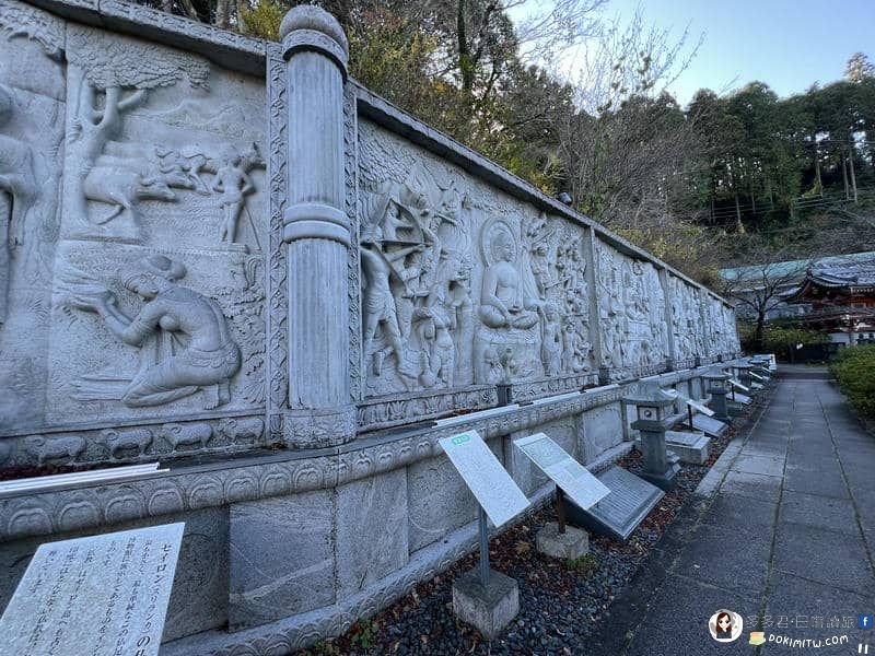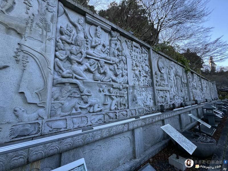 來自印度佛教傳說浮雕「釋迦牟尼傳」,高3m、全長50m、重300噸,昭和62年(1987年)落成,這一面是第一部分。