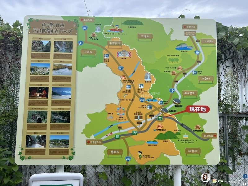 案內所外面、縣道#7路旁,掛有「馬籠宿案內圖」,詳細列出馬籠宿內部信息,各種設施、商店、宿泊、食堂的位置。