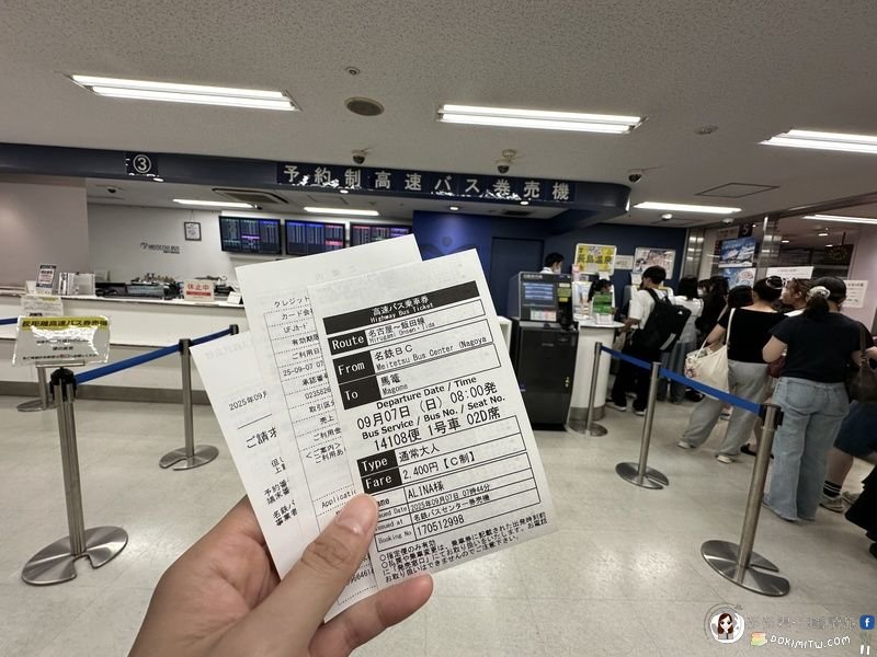 一早到達名古屋駅,在三樓名鐵バスセンター,買了名鐵巴士前往馬籠的巴士車票,票價一人單程JPY 2,400。長龍排隊買票是搭乘另一路線旅客,我們是照片中央桌上的券売機(售票機)操作購票的。
