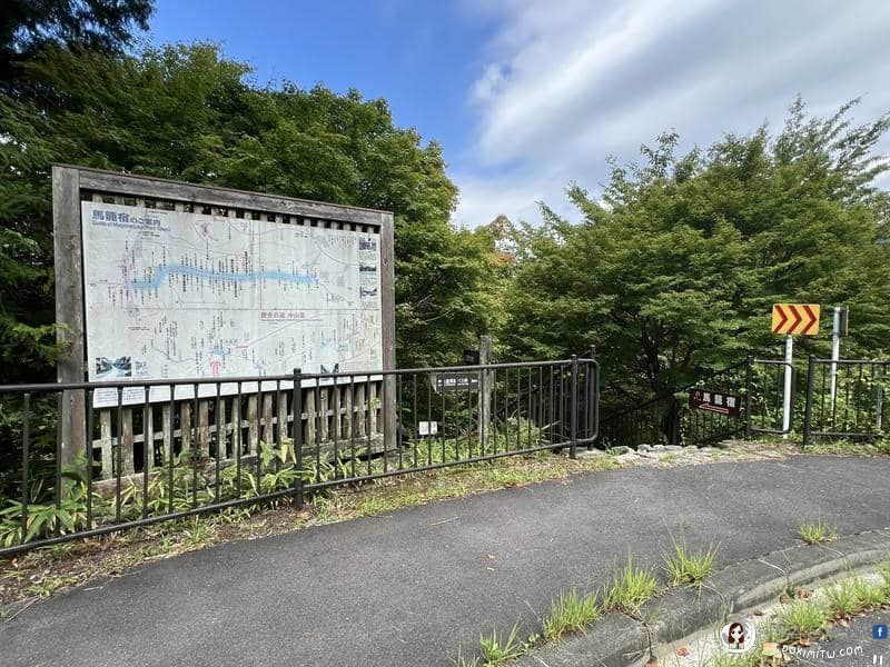 縣道#7公路走約600米,來到近道路口,此處懸掛一幅巨大的馬籠宿地圖介紹。旁邊,也有路標:馬籠宿460米、中央道馬籠バス停0.6km。