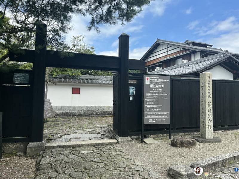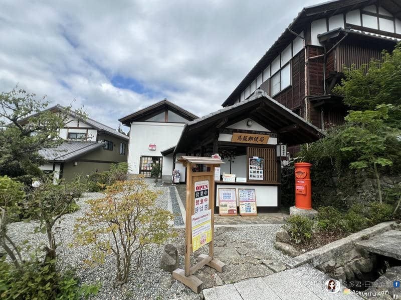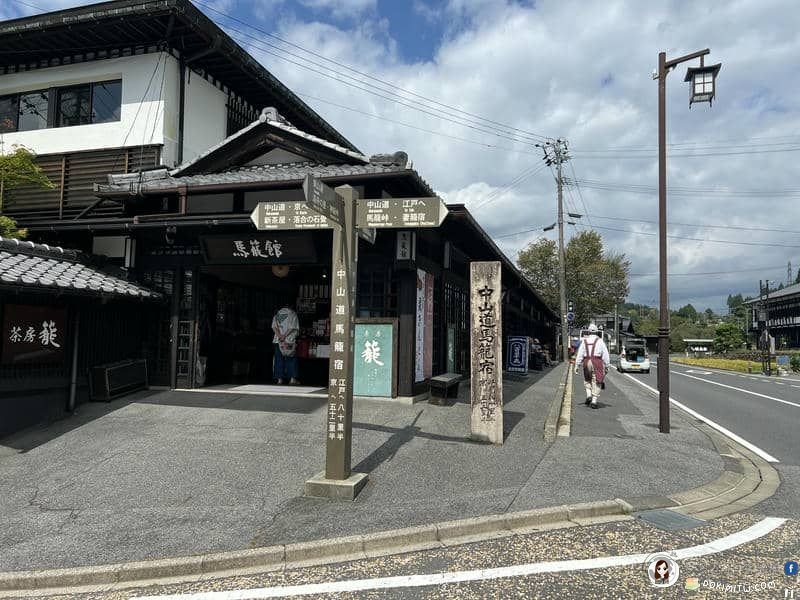 在下入口處,值得一提的是,斜對街角的「中山道馬籠宿道標」石柱,標示:江戶八十里半、京都五十里半,這是歷史地標。另外,旁邊建築則是馬籠館別館。