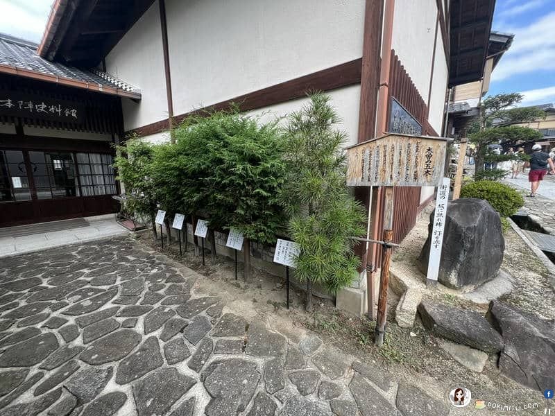 在「馬籠脇本陣史料館」的入口右側,豎立「木曾五木」看板,意思指日本長野縣木曾山區的五種珍貴樹木─日本扁柏、日本金松、明日檜、花柏、鼠子,這些是木曾所使用木材的來源。