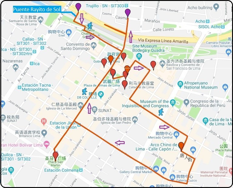 Jirón Andahuaylas與Jirón cusco路口,從這裡一路沿著Jirón cusco,17分鐘走到Jirón de la Unión步行街口。