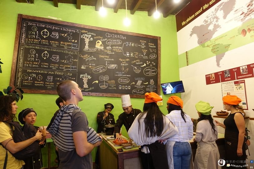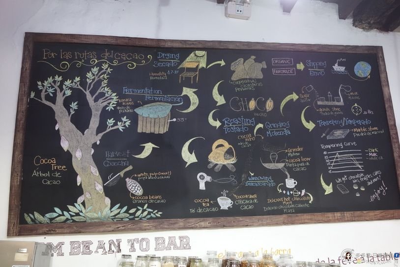 黑板上,說明秘魯可可Cacao和巧克力Chocolate的生產工序。