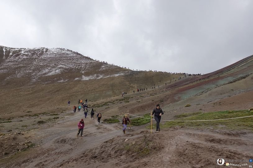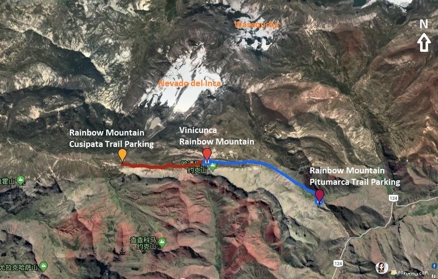 接著,徒步或騎馬(紅線)約3公里、一小時,抵達彩虹山(Vinicunca)。