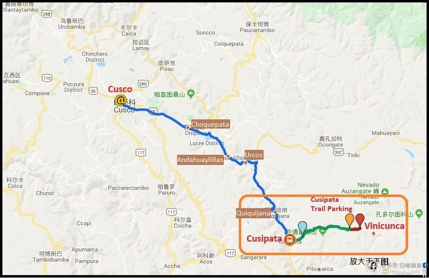 從庫斯科(武器廣場)開始,沿3S公路往東南方向走,經過Choquepata、Andahuaylillas、Urcos、Quiquijana,一直到Cusipata為止,此段(藍線)路程約82公里。