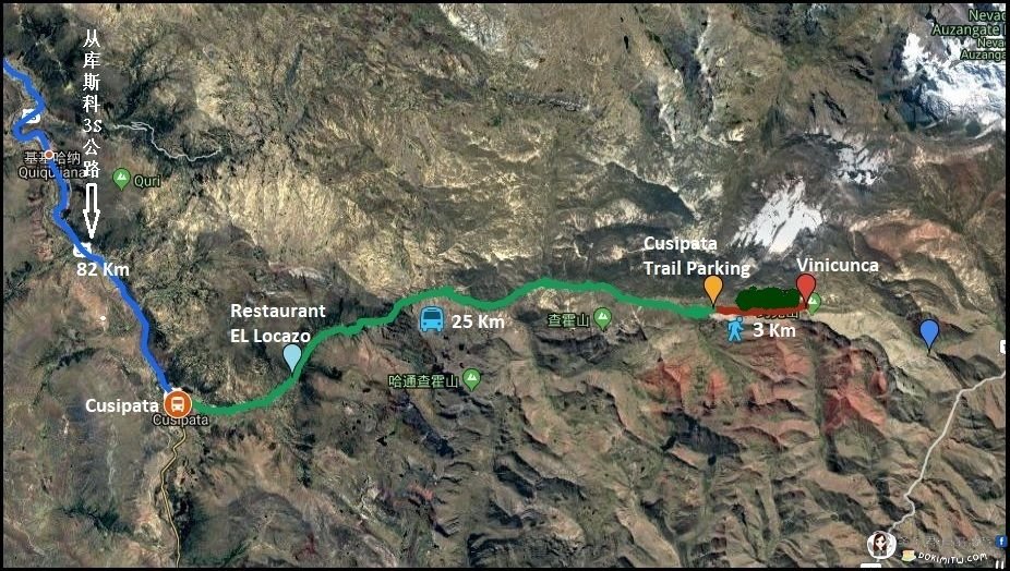 再由Cusipata往東,走土路小道(綠線)約25公里,到達停車場(Cusipata Trail Parking),此處也是徒步起始點(Punto de Inicio de Caminata)。車程總共約107公里,需三小時。