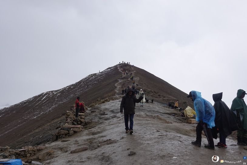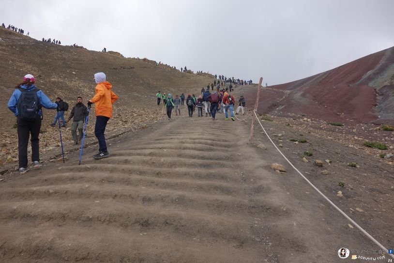 末段的數十米路,最為艱辛,因為處在將近海拔5,000米。路旁有繩索可以做為輔助,但儘管地濕路滑,我們還是沒用到。山脊上的人群及觀景點,一點一點的黑影,看得更清晰。