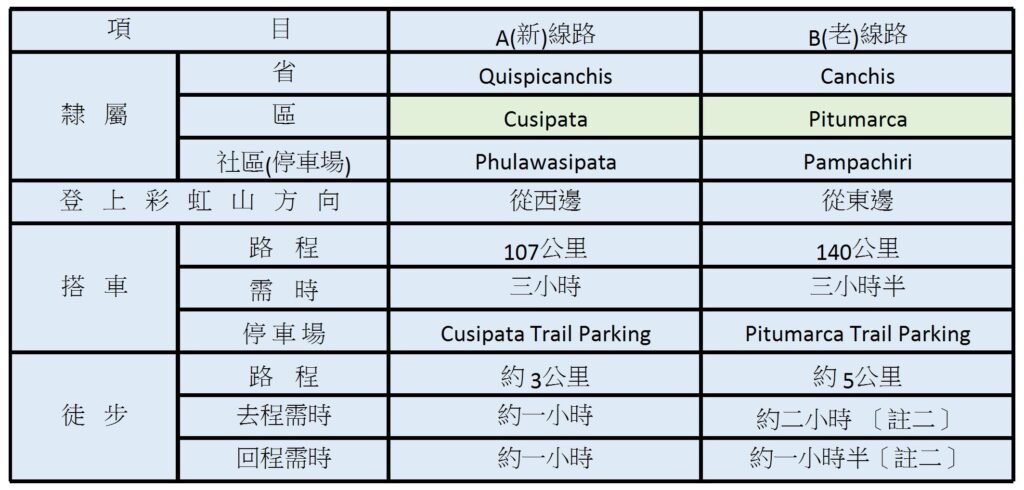 〔註二〕有些旅遊團是由Quesoyuni附近開始走,徒步約8~10公里,需時三小時(回程二小時半),抵達彩虹山(Vinicunca)。